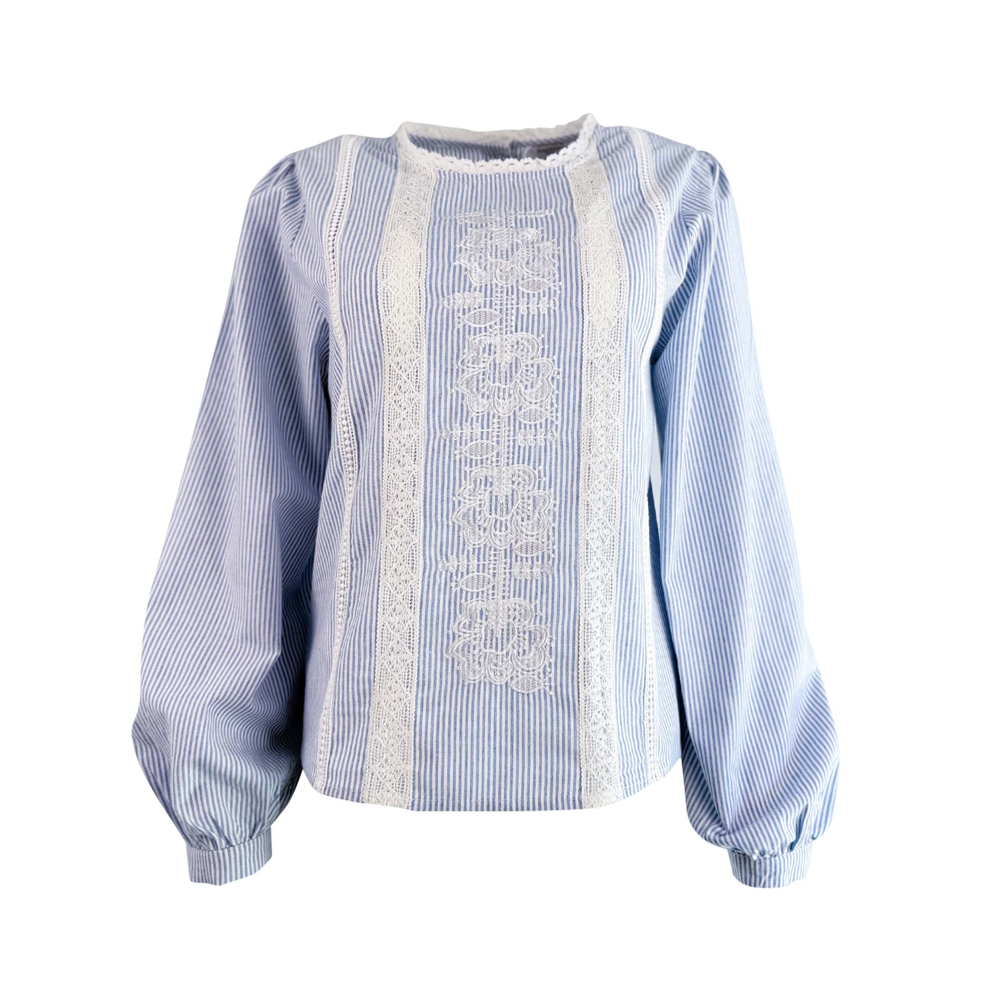 Diese Bluse aus 100 % Baumwolle besticht durch ihr frisches, zeitloses Design. Das blau-weiß gestreifte Muster wirkt klassisch, während die weiße Blumenstickerei auf der Vorderseite für eine feminine Note sorgt. Der Rundhalsausschnitt ist mit zarter weißer Spitze veredelt und die leichten Puffärmel verleihen dem Oberteil einen Hauch von Romantik. Dank der hochwertigen Baumwolle ist die Bluse angenehm zu tragen – perfekt für Alltag, Büro oder besondere Anlässe.