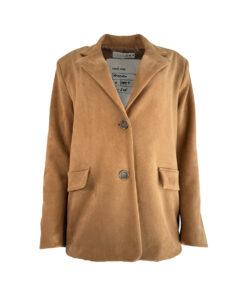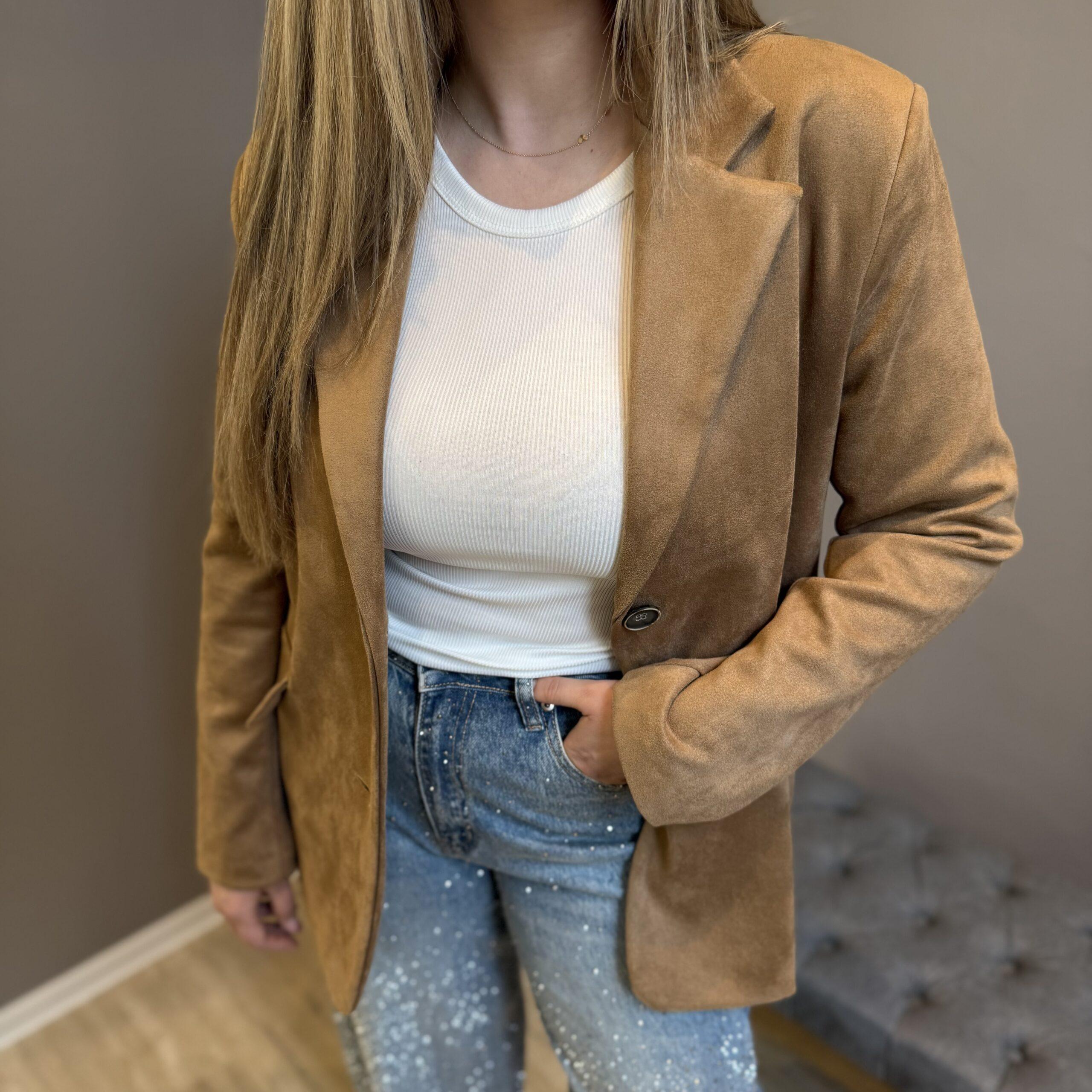 Blazer in weicher Wildleder-Optik in warmem Cognac mit zwei Knöpfen zum Schließen. Angenehm zu tragen und elegant im Look, ideal für stilvolle Business- oder Casual-Outfits.