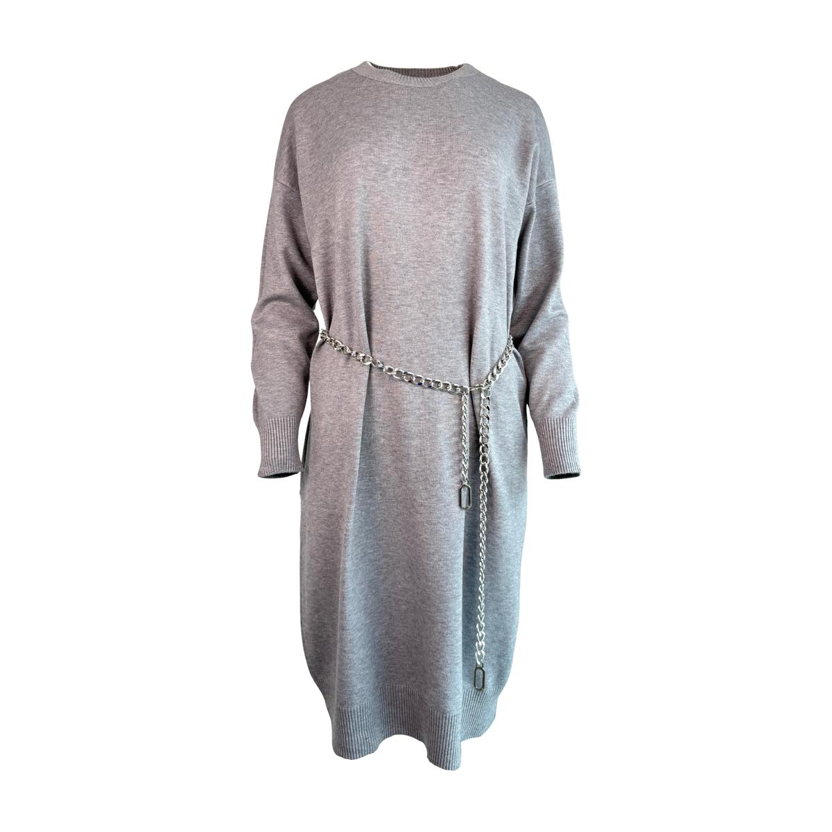 Knie-langes Strickkleid mit rundem Halsausschnitt, super bequem und angenehm zu tragen. Versetzt mit verstellbarem Kettengürtel. Aus hochwertigen Materialien (51% Viskose, 10% Elasthan, 39% Polyamid) – weich, stylisch und vielseitig kombinierbar.