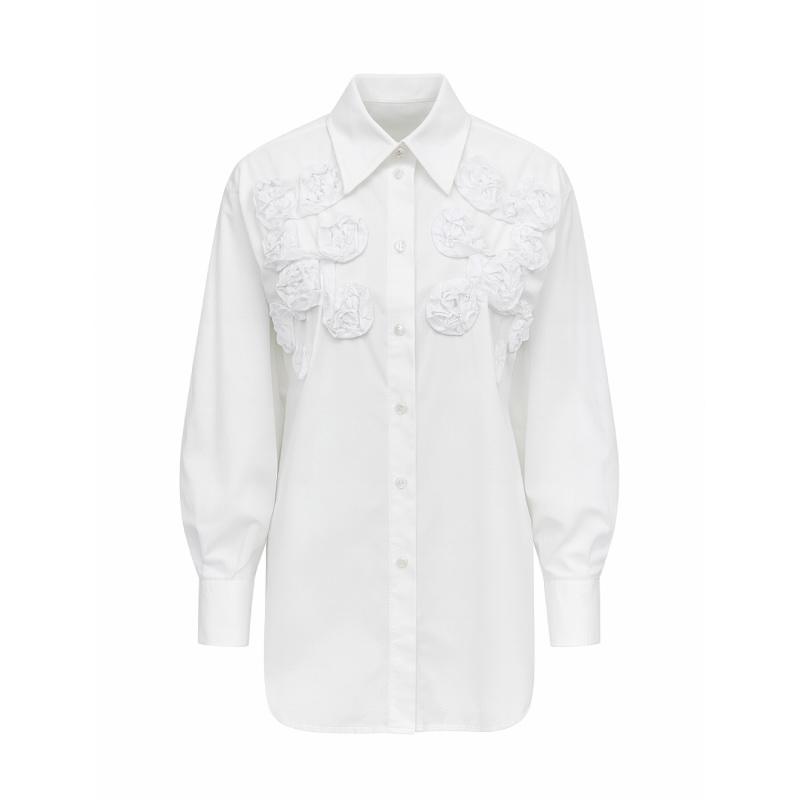 Lange weiße Bluse aus matter Baumwolle – ein besonderes Stück mit edlen 3D-Rosen-Details auf der Vorderseite. Das hochwertige Material aus 97 % Baumwolle und 3 % Elasthan sorgt für angenehmen Tragekomfort und eine perfekte Passform. Diese Bluse verbindet feminine Eleganz mit modernem Design und lässt sich sowohl klassisch zur Hose als auch lässig über Leggings tragen. Ein stilvolles Highlight für jeden Anlass.