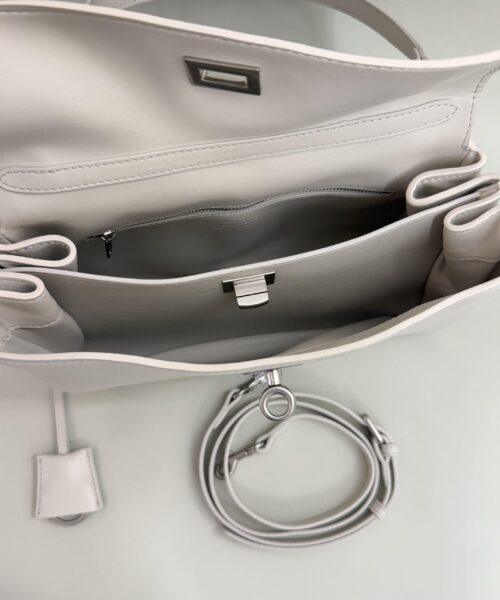 Schlichte Eleganz in ihrer feinsten Form: Diese mittelgroße Tasche aus hochwertigem Leder in gebrochenem Weiß überzeugt mit dezenten, silbernen Akzenten und zwei praktischen Innenfächern. Ein stilvoller Allrounder für Alltag, Büro oder besondere Anlässe – zeitlos, edel, vielseitig.