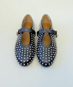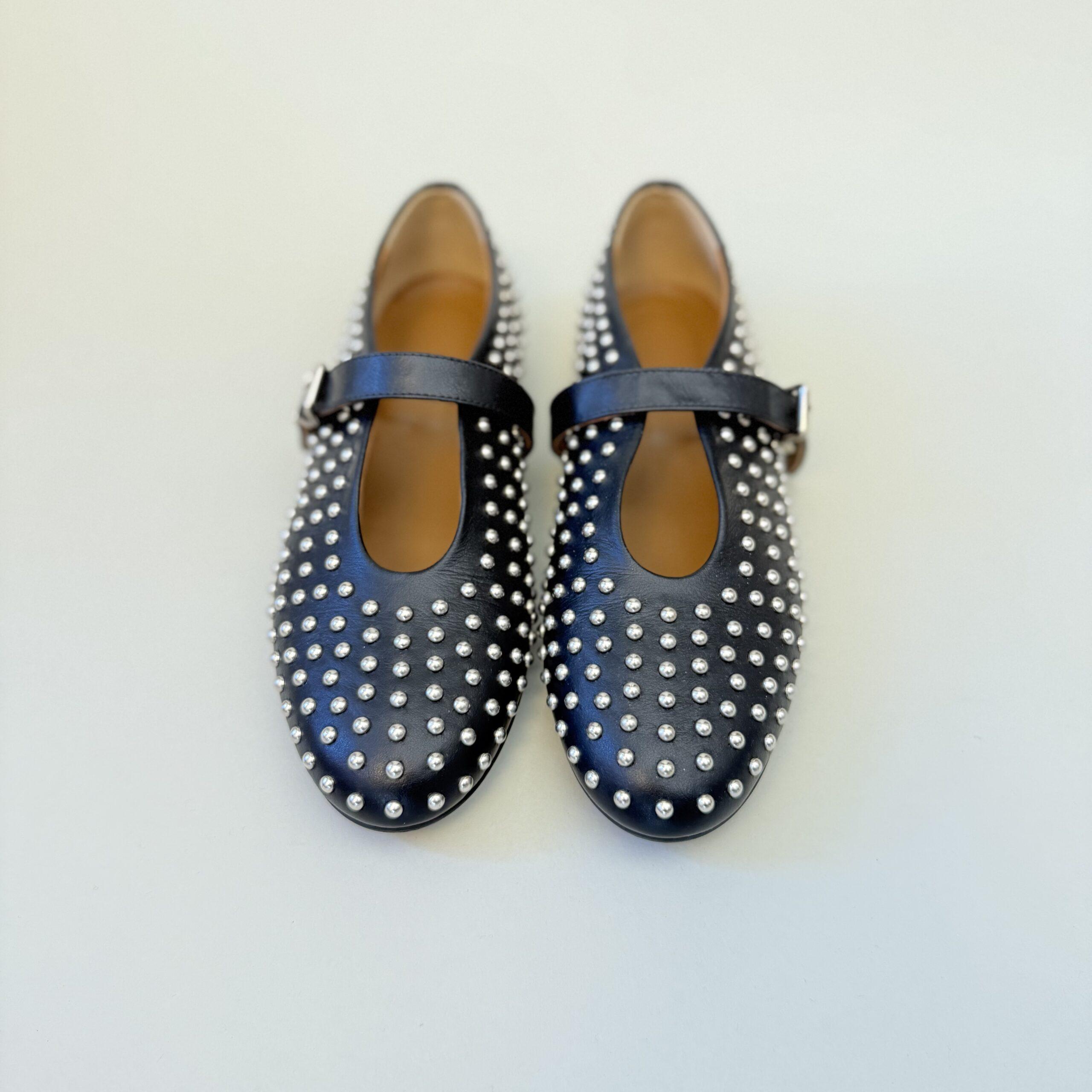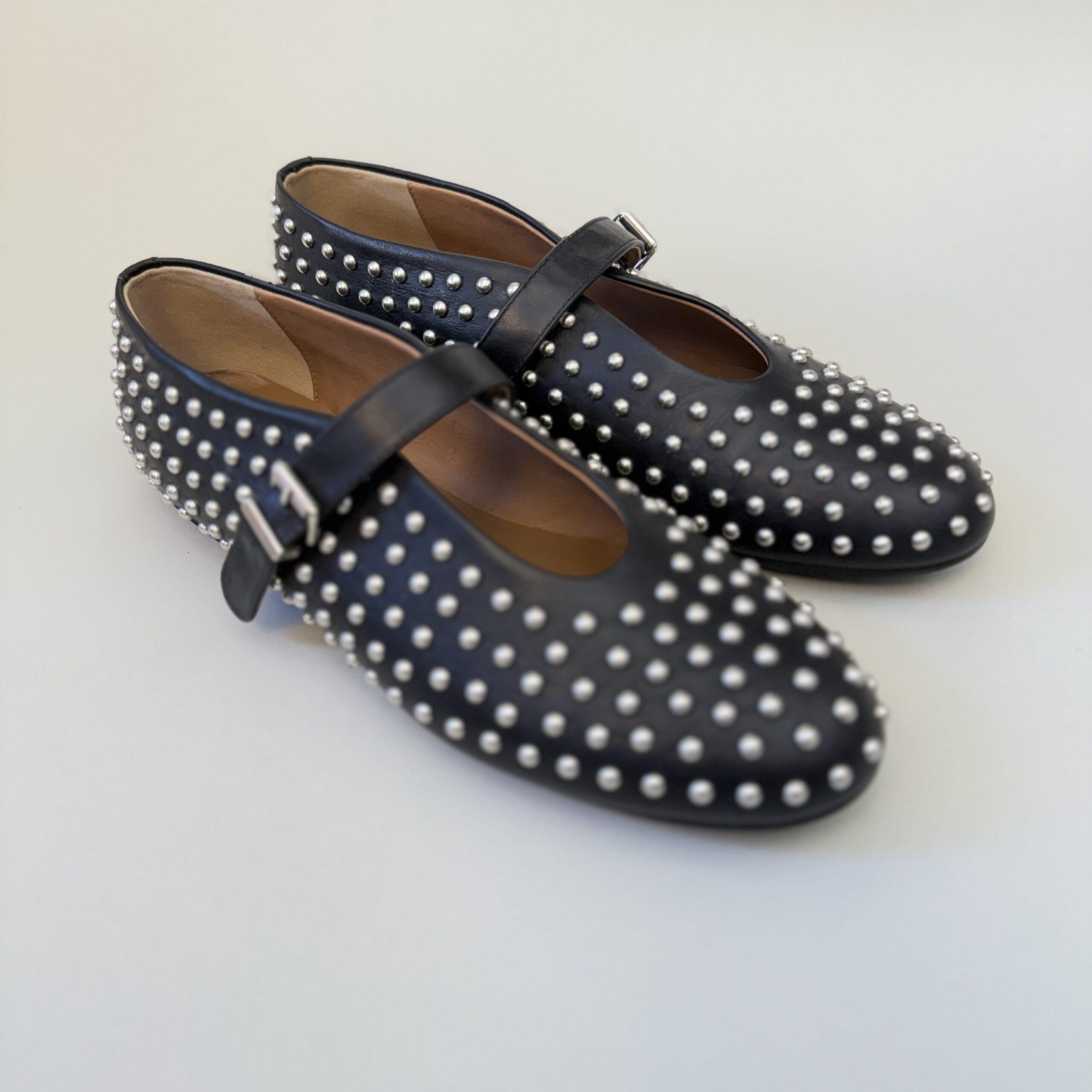 Ein Klassiker neu interpretiert: Diese Ballerinas aus echtem Leder kombinieren den zeitlosen Mary-Jane-Look mit rockigen Nieten-Details. Der charakteristische Riemen sorgt für femininen Halt, während silberne Nieten einen Hauch Rebellion ins Design bringen. Perfekt für alle, die Eleganz mit Edge lieben.