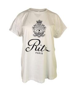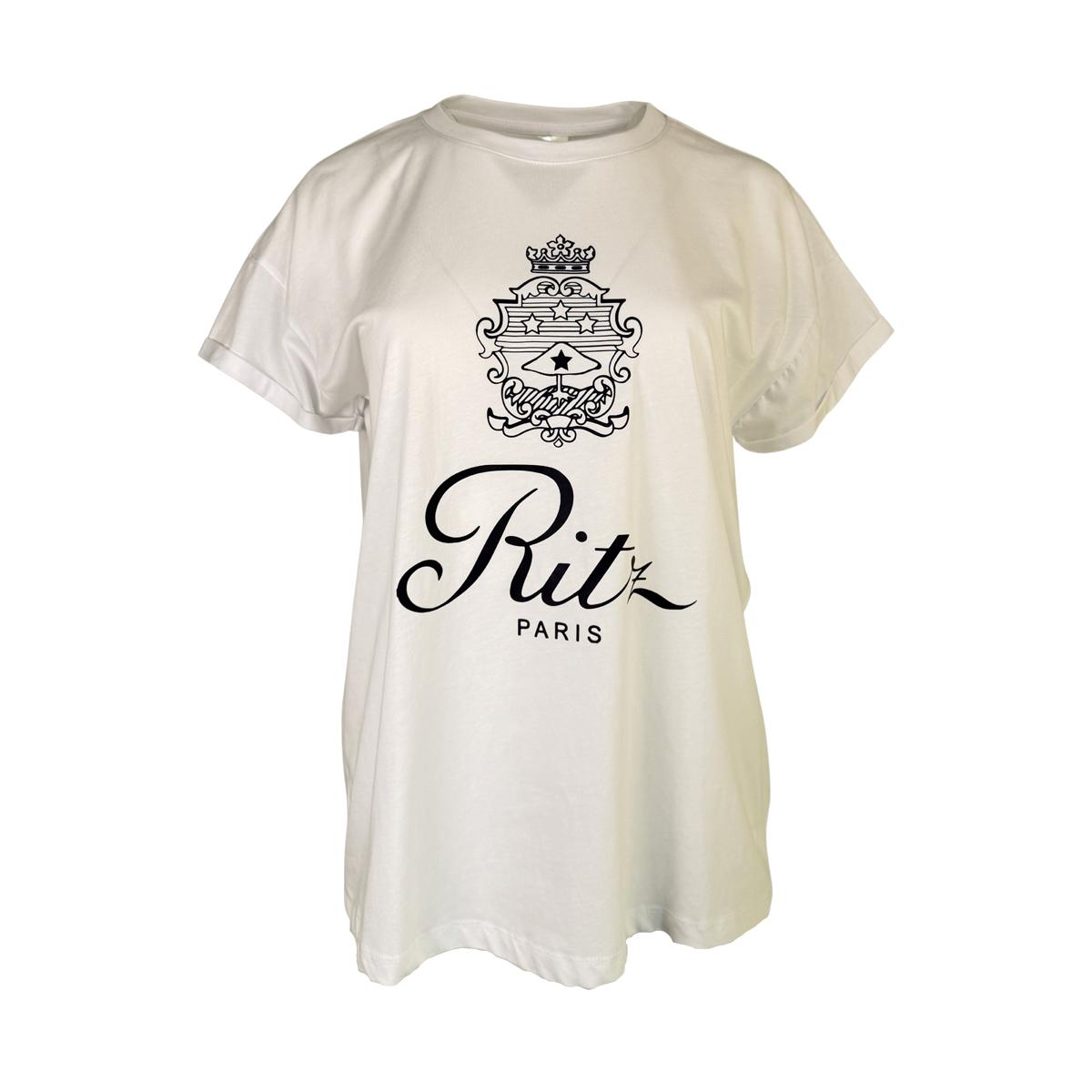Weißes Baumwoll-T-Shirt mit „Paris Ritz“-Print in Dunkelblau, kombiniert mit einem passenden Cape. Bequem, stylisch und vielseitig – perfekt für elegante Casual- oder Freizeitlooks.100% Baumwolle