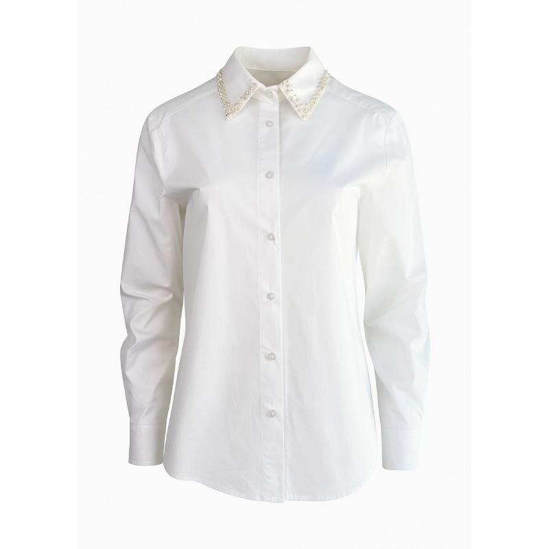 Diese weiße Bluse aus 100 % Baumwolle besticht durch ihre schicke Eleganz und die feinen Perlenverzierungen am Kragen. Sie ist in einer One Size erhältlich und passt ideal für Größen S–M. Die leicht taillierte Form betont dezent die Silhouette und verleiht dem Look feminine Raffinesse. Perfekt geeignet für einen eleganten Business-Look oder stilvolle Alltagsoutfits.