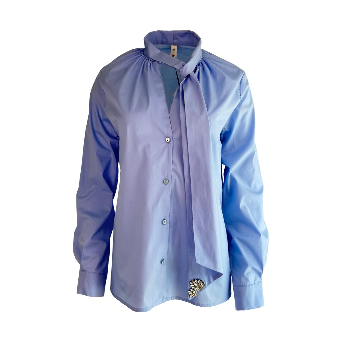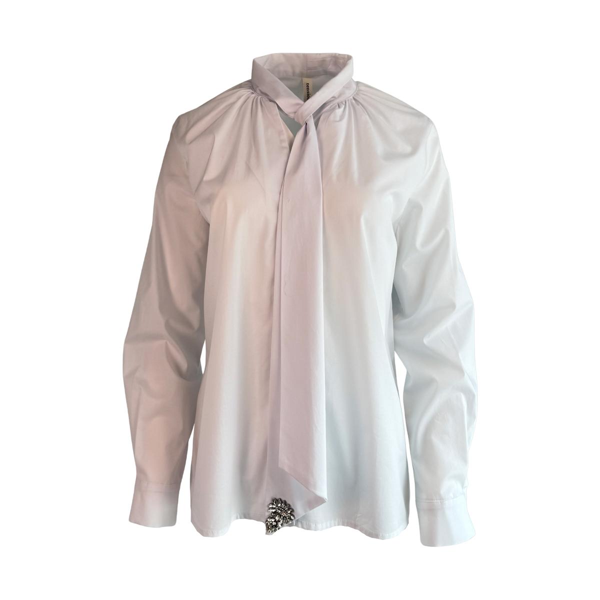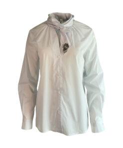 Feine weiße Bluse aus hochwertiger Baumwolle (97 %) mit 3 % Elasthan für leichten Stretchkomfort. Edles silbernes Detail an der Schleife verleiht ihr einen stilvollen Akzent.Schlicht und elegant – ideal für Büro, Events oder stilvolle Alltagslooks.